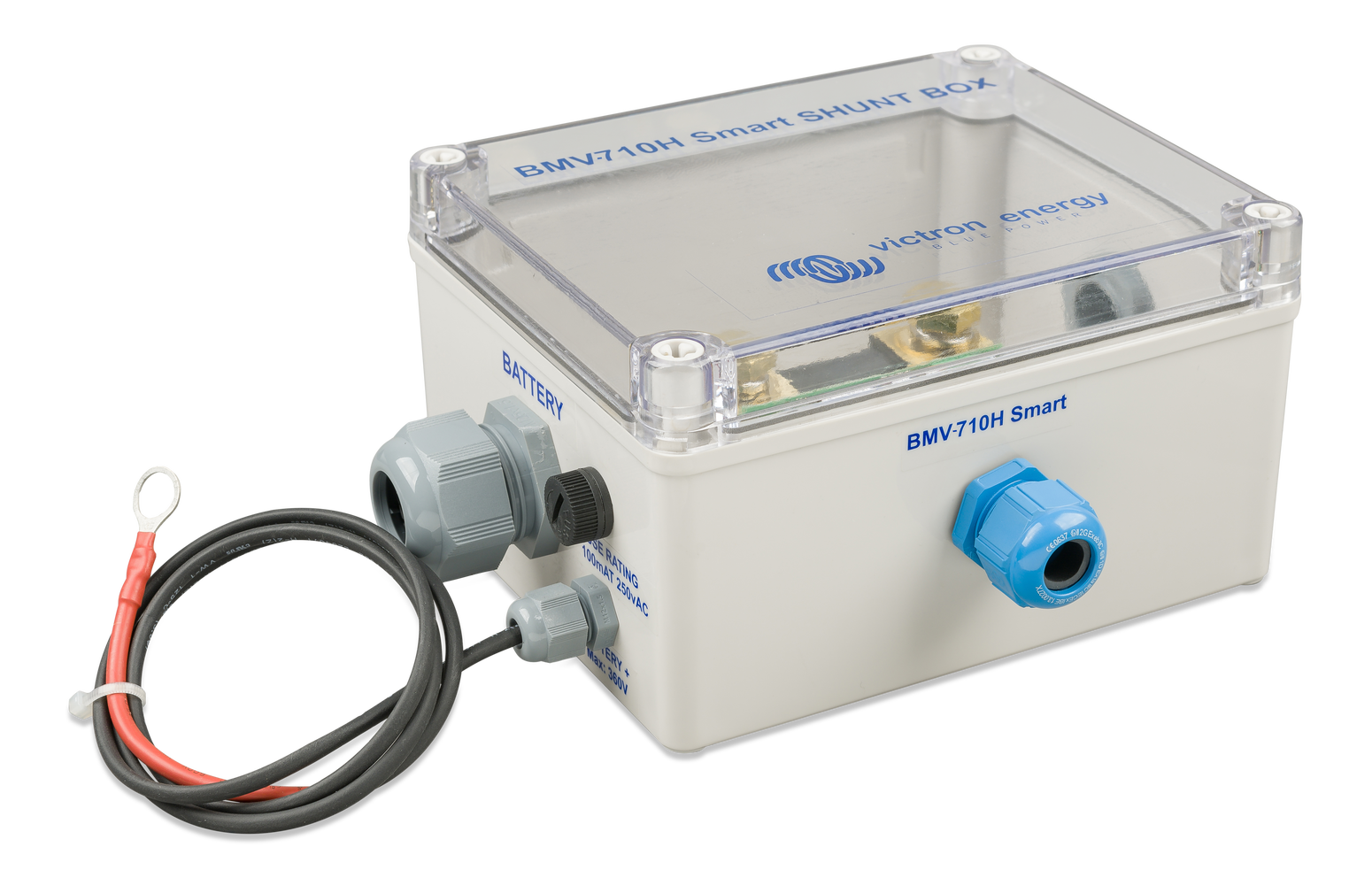 Der BMV-700H wird mit einer runden Kopfeinheit, einer quadratischen Blende, einem Schraubring zur Befestigung, einem 10m langen UTP-RJ12-Kabel, einem abgesicherten Stromversorgungskabel und einem 500A/50mV-Shunt geliefert. Wegen der Hochspannungsanwendung ist der Shunt in einem speziellen Gehäuse untergebracht.