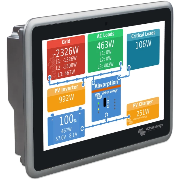 Diese GX-Kommunikationszentrale ermöglicht es Ihnen, Ihr System von jedem Ort aus stets perfekt zu kontrollieren und seine Leistung zu maximieren. Greifen Sie einfach über unser Victron Remote Management (VRM)-Portal auf Ihr System zu, oder greifen Sie direkt auf Ihr System zu, indem Sie den integrierten Touch Bildschirm, ein Multifunktionsdisplay (MFD) oder die VictronConnect App verwenden.