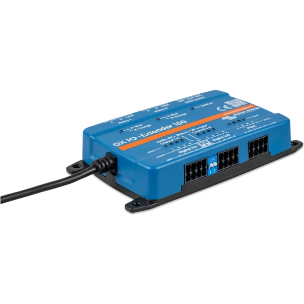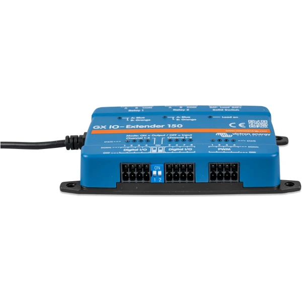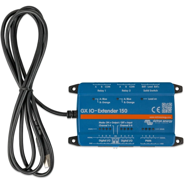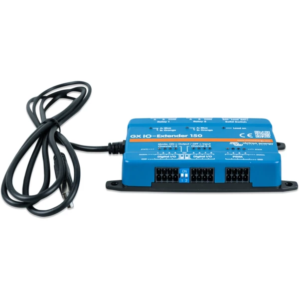 Der GX IO-Extender 150 erweitert die Eingangs- und Ausgangskanäle (I/O) eines GX-Geräts und ermöglicht die nahtlose Integration zusätzlicher Sensoren, Steuerungen und externer Geräte. Er wird über USB angeschlossen, das auch als Stromquelle dient und eine einfache und effiziente Erweiterungslösung darstellt. Das Gerät kann sowohl über Node-RED auf dem GX-Gerät als auch über das Digital Switching – Panel in der Benutzeroberfläche gesteuert werden.