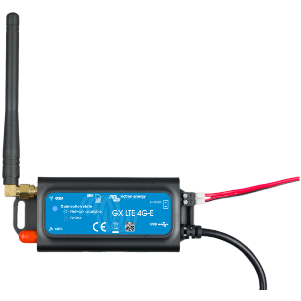 Das GX LTE 4G ist ein Mobilfunk-Modem für die GX Monitoring-Lösungen (z.B. Cerbo GX). Es stellt eine mobile Internetverbindung für das System her und ermöglicht die Verbindung mit dem VRM-Portal. Es funktioniert in 2G-, 3G- und 4G-Mobilfunknetzen.