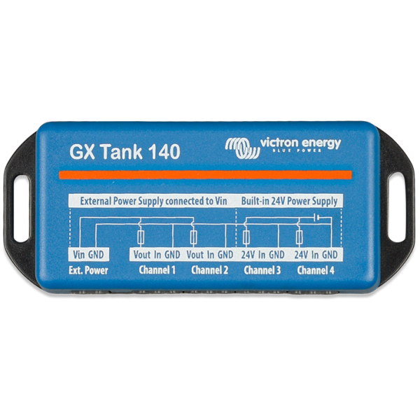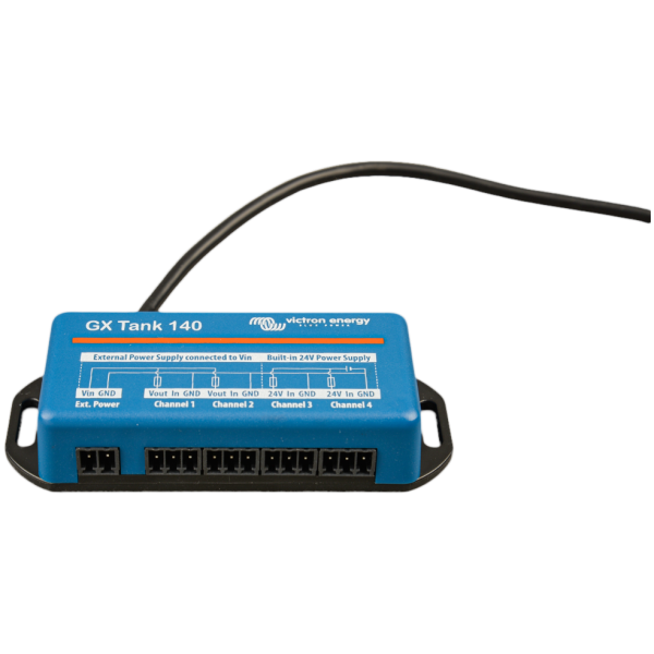 Der GX Tank 140 erfasst Messwerte von bis zu vier Tankfüllstandssensoren. Es handelt sich um ein Zubehör für unser Sortiment an GX-Systemüberwachungsprodukten, von denen Cerbo GX das am häufigsten verwendete Modell ist.