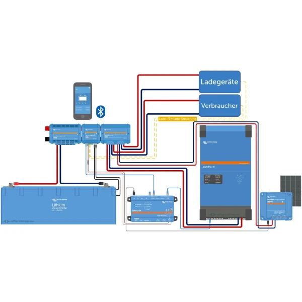 Eine Möglichkeit dazu ist DVCC (Digital Voltage and Current Control): Über ein GX-Gerät wie den Cerbo GX können sämtliche über Datenleitungen mit dem System verbundenen Geräte (z.B. MultiPlus, Quattro, SmartSolar oder Orion XS) direkt vom Lithium-System gesteuert werden.