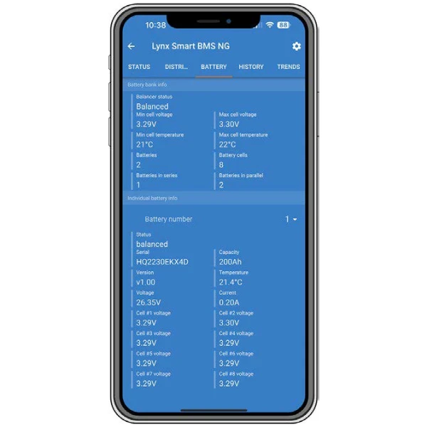 Über die VictronConnect App oder ein GX-Gerät und das VRM Portal können sämtliche Batterie-Parameter ausgelesen werden. Die Verarbeitung dieser Daten erfolgt durch das BMS: Dieses erkennt automatisch die Systemspannung und die Anzahl der Batterien in Parallel-, Serien- und Serien/Parallelschaltung. Das BMS (ab sofort Lynx Smart BMS NG 500 A bzw. 1000 A, weitere Modelle folgen) ist obligatorisch und muss separat erworben werden. Die Batterie-Firmware wird automatisch durch das BMS aktualisiert.