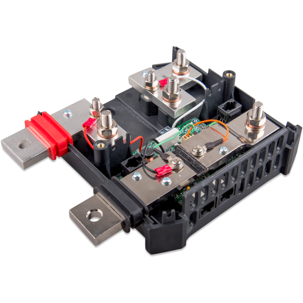Der Lynx Shunt VE.Can ist ein intelligenter 1000 A Shunt (Nebenschlusswiderstand) mit einer Vorrichtung für eine Sicherung. Mit dem eingebauten Batteriewächter lässt sich der Ladezustand der Batterie akkurat überwachen. Zum Auslesen der Informationen ein GX-Gerät (z.B. Cerbo GX) verwenden. Teil des modularen Lynx Verteilungssystems.