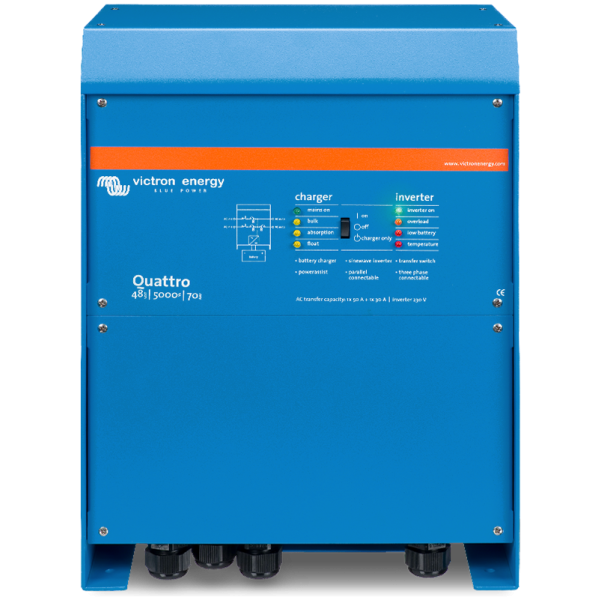 Ähnlich wie der MultiPlus ist auch der Quattro eine Kombination aus Wechselrichter und Ladegerät. Außerdem kann er zwei AC-Eingänge akzeptieren und sich automatisch mit der aktiven Quelle verbinden. Diese elegante Lösung bietet zahlreiche Funktionen wie die eines echten Sinus-Wechselrichters, eine adaptive Lade-Funktion, eine Hybrid PowerAssist-Technologie sowie mehrere Möglichkeiten zur Systemintegration: zum Beispiel Drei-Phasen- oder Spalt-Phasen-Betrieb sowie Parallel-Betrieb.