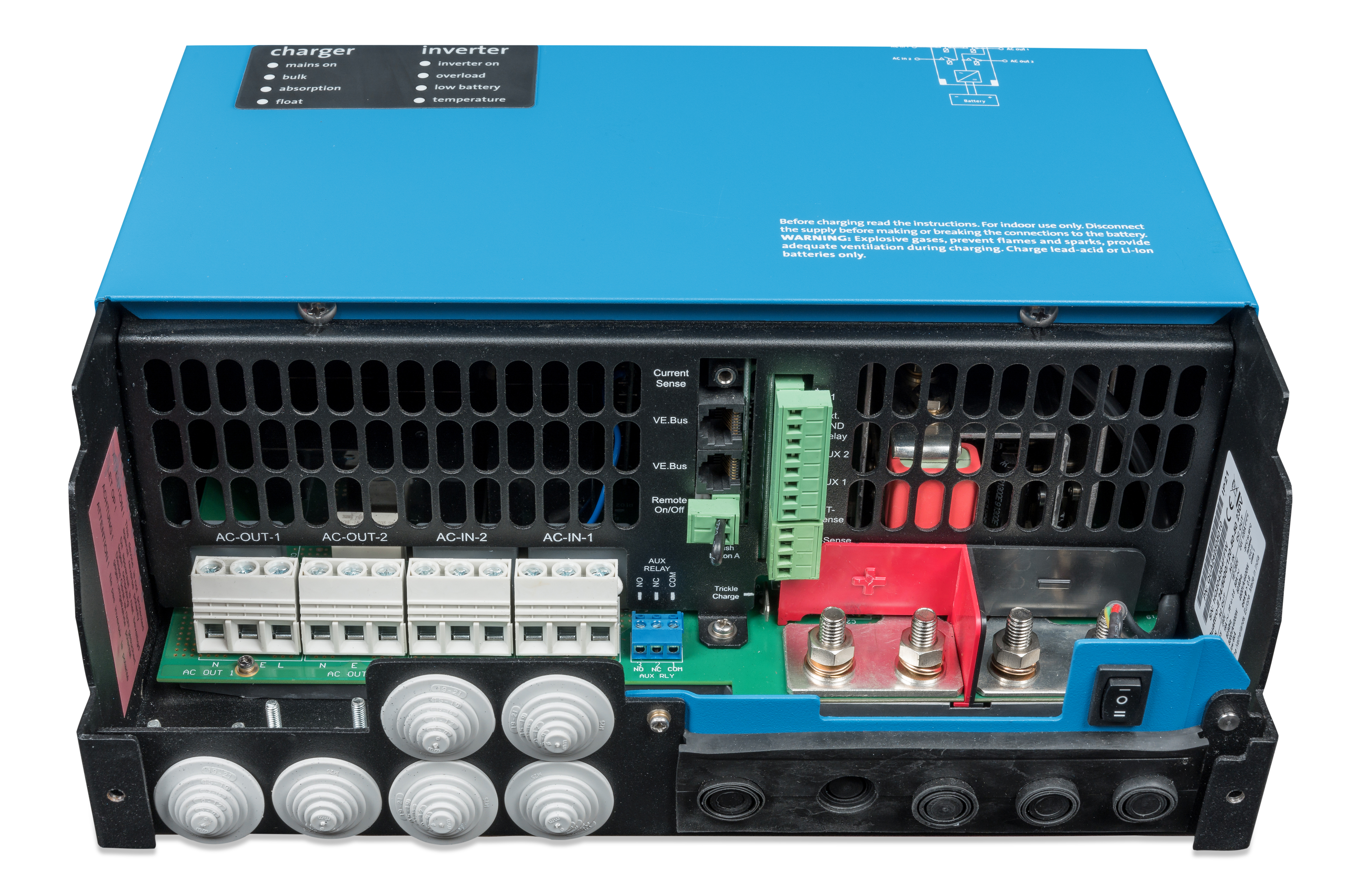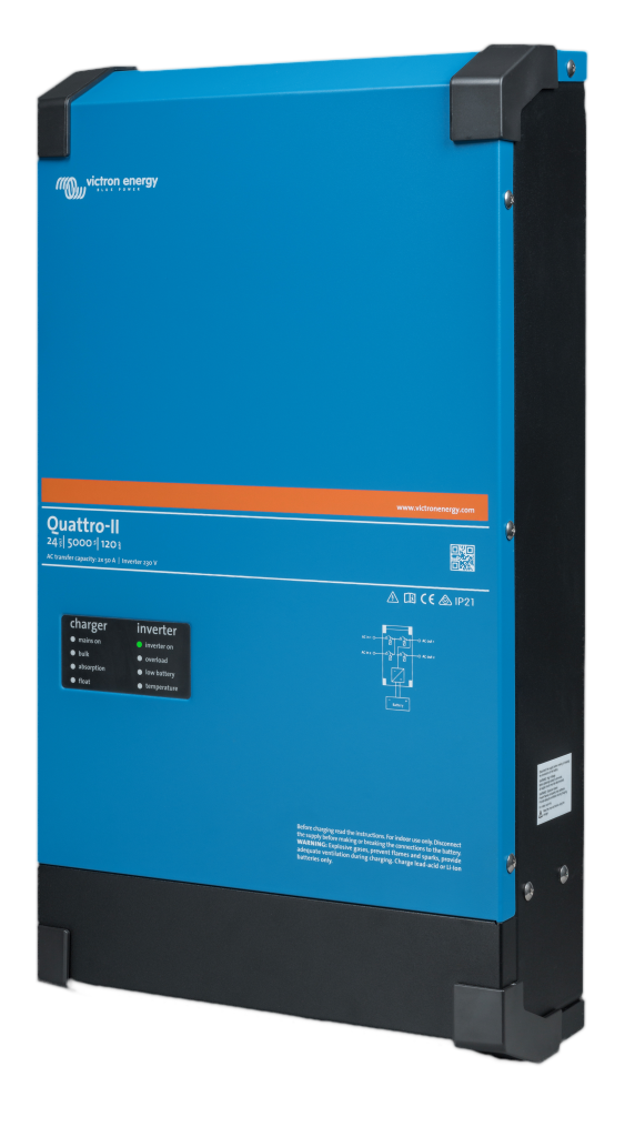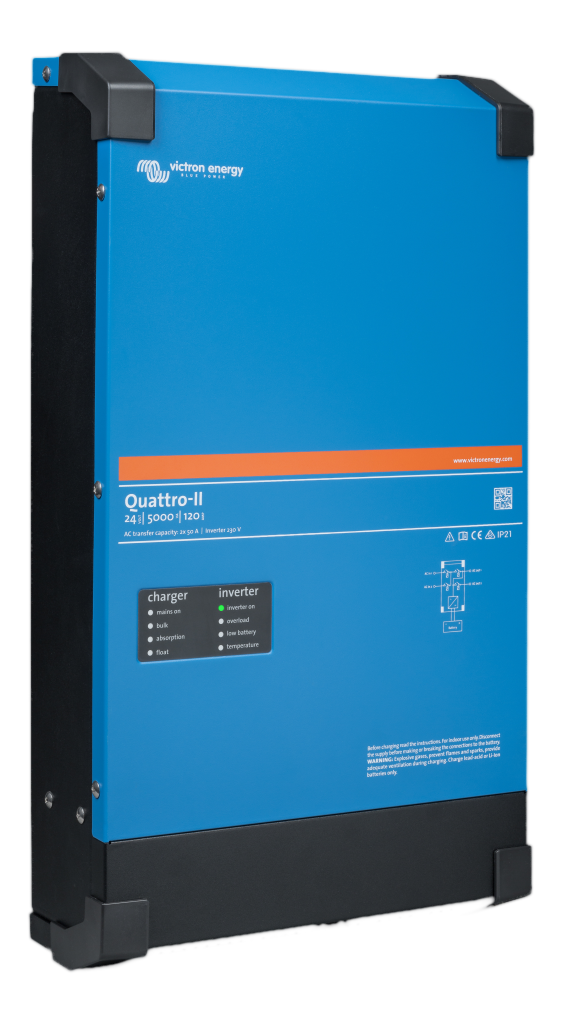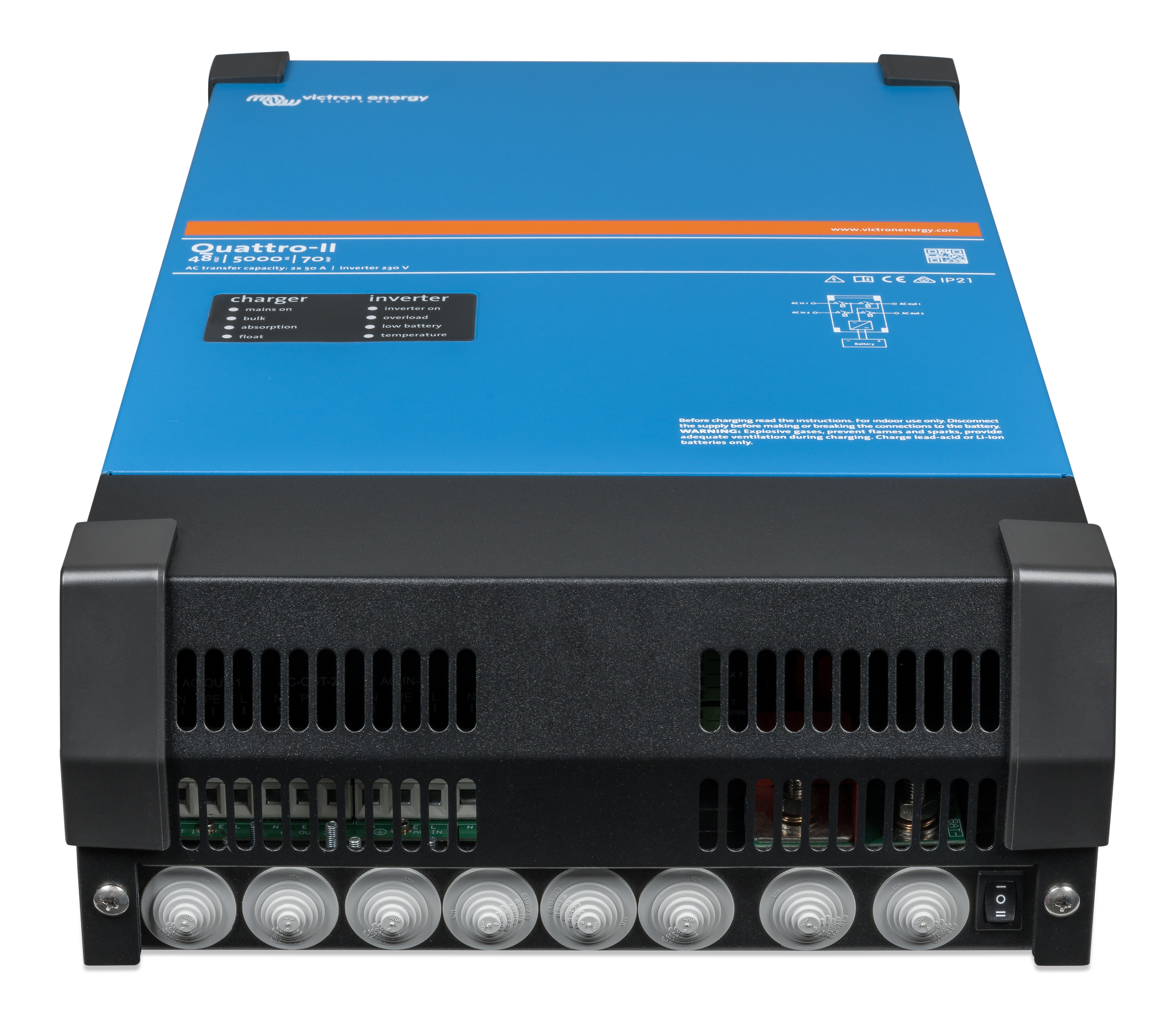 Ähnlich wie der MultiPlus-II ist auch der Quattro-II eine Kombination aus Wechselrichter und Ladegerät. Außerdem kann er zwei AC-Eingänge annehmen und sich automatisch mit der aktiven Quelle verbinden. Diese elegante Lösung bietet zahlreiche Funktionen wie die eines echten Sinus-Wechselrichters, eine adaptive Lade-Funktion, Hybrid PowerAssist-Technologie sowie mehrere Möglichkeiten zur Systemintegration, zum Beispiel 3-Phasen- oder Split-Phasen-Betrieb sowie Parallel-Betrieb.