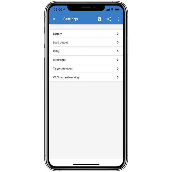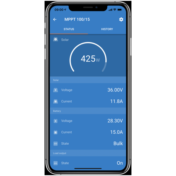 Die Modelle 75/10, 75/15, 100/15 und 100/20 besitzen einen Lastausgang, der mit der VictronConnect-App abhängig von verschiedenen Faktoren (z.B. Batteriespannung, Tag/Nacht, …) programmiert werden und Ströme entsprechend dem maximalen Strom des Reglers durchschalten kann. So kann z.B. verhindert werden dass eine Batterie tief entladen wird oder eine Lampe kann so gesteuert werden, dass sie nur nach Sonnenuntergang aktiv ist.